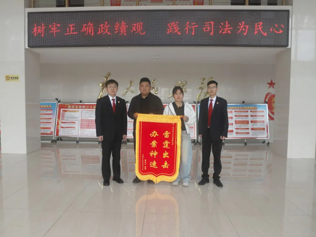 4月3日上午,一执行案件的当事人郭某某来到商水法院,向执行局干警贺舒畅、邵鹏程送上绣有“办案神速 雷霆出击”的锦旗,对法院高效追回拖欠7年之久的欠款表示感谢。